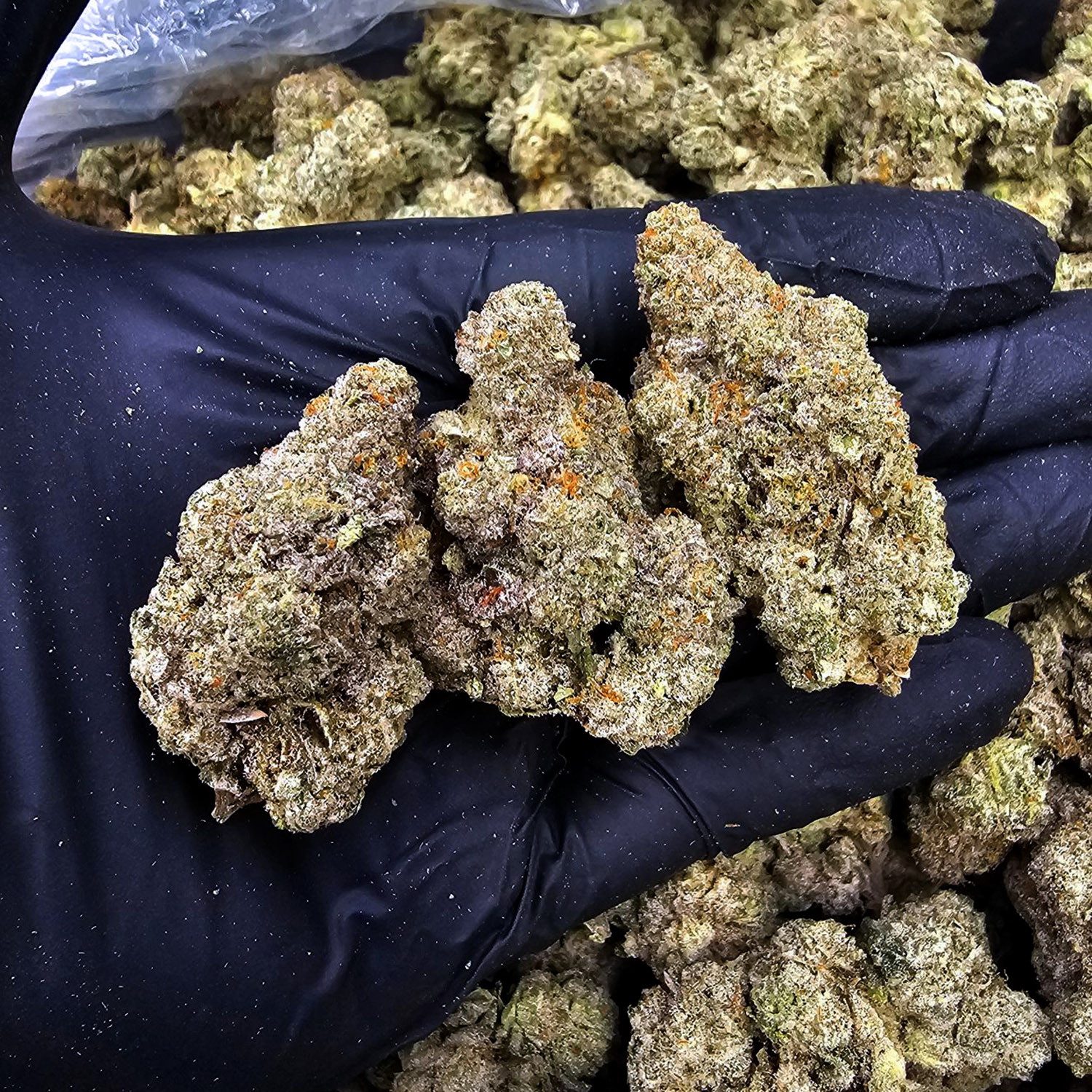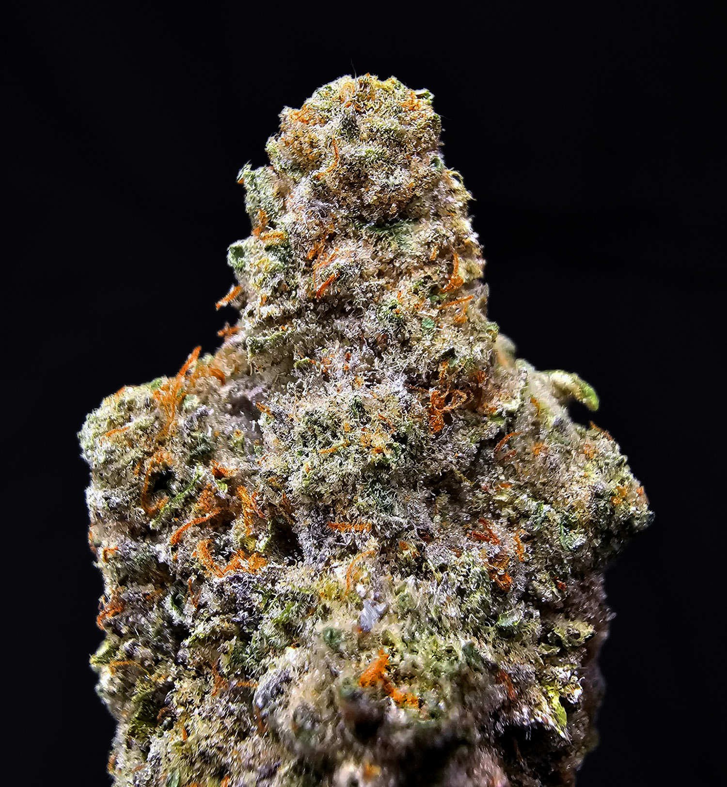 🔹 Appearance: Chunky olive green buds with orange hairs and icy white trichomes