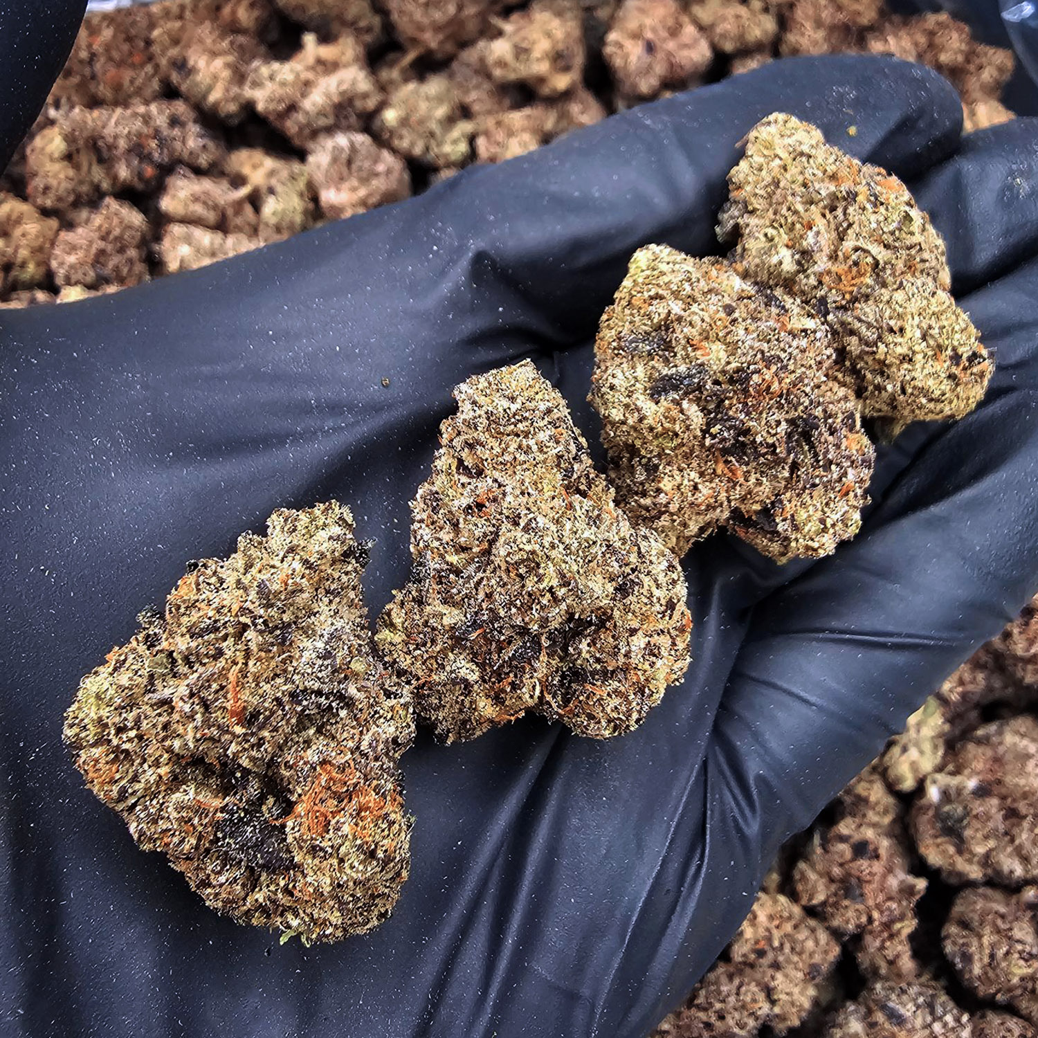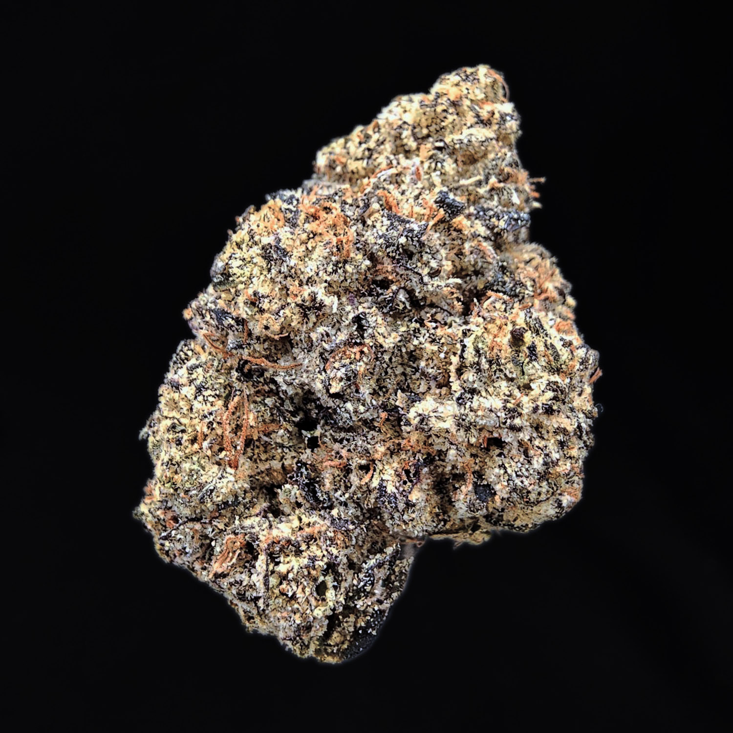 Appearance: Dense buds with deep purple hues, bright orange pistils, and heavy trichome frosting