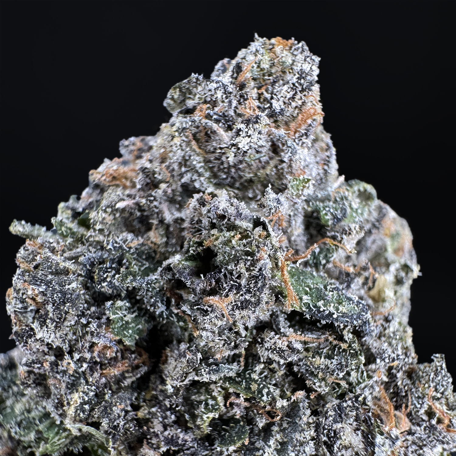 Small, rounded mint-green buds accented with vivid pink undertones, bright orange hairs, and a frosty coat of tiny white crystal trichomes.