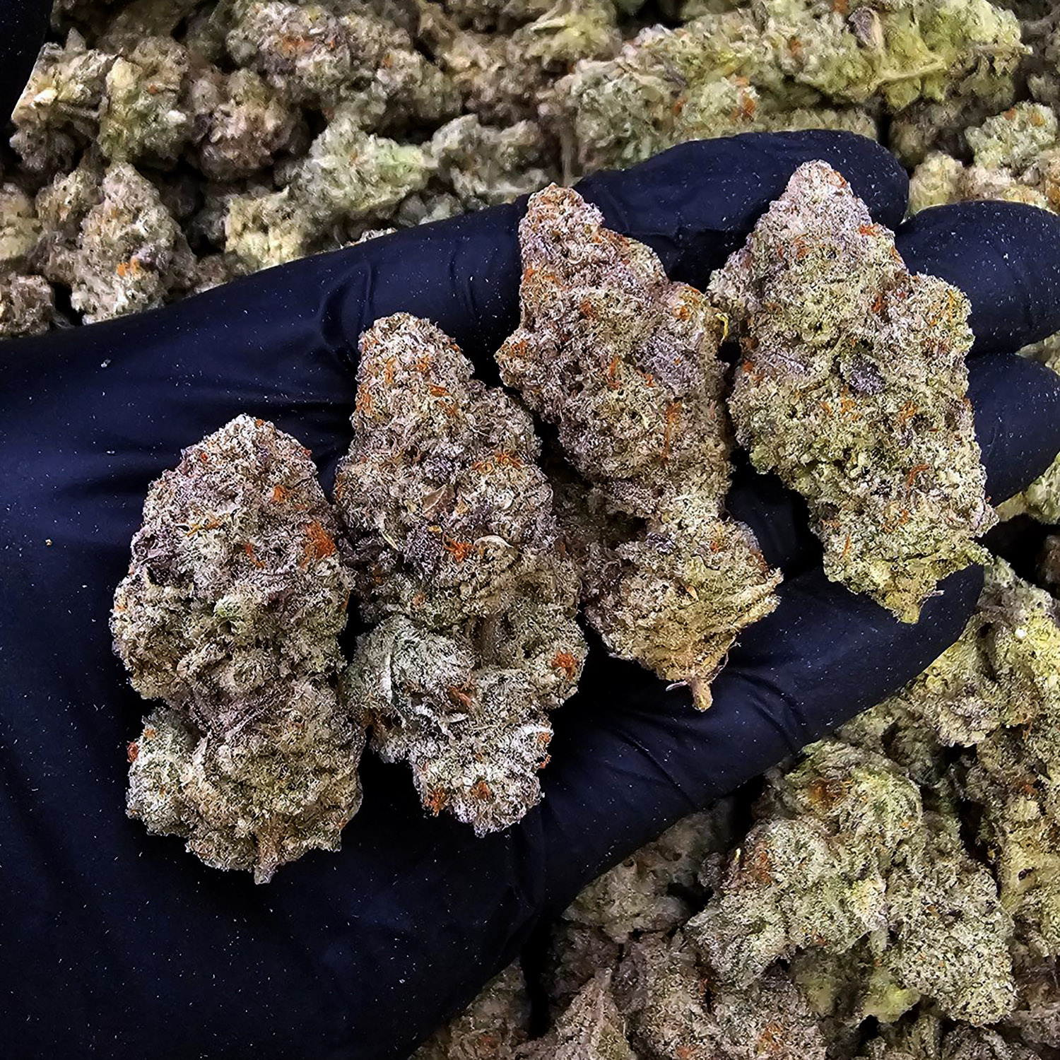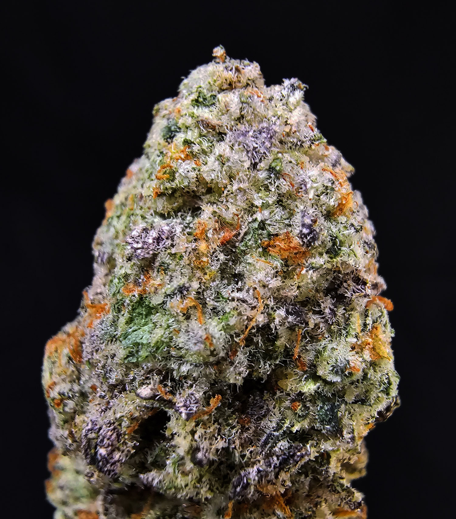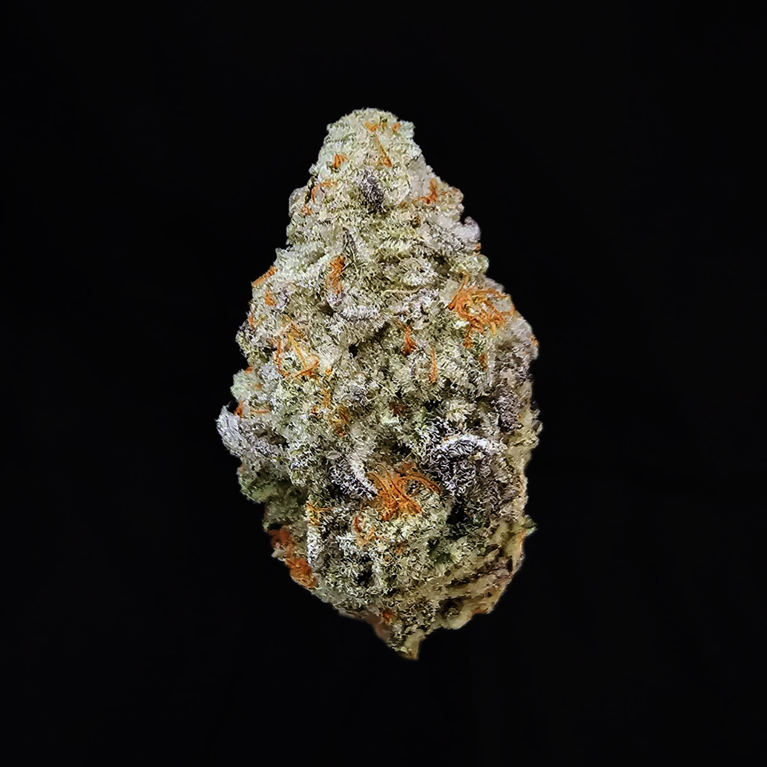 👁️ Appearance: Elongated buds, green with purple accents, orange pistils, heavy crystal trichomes