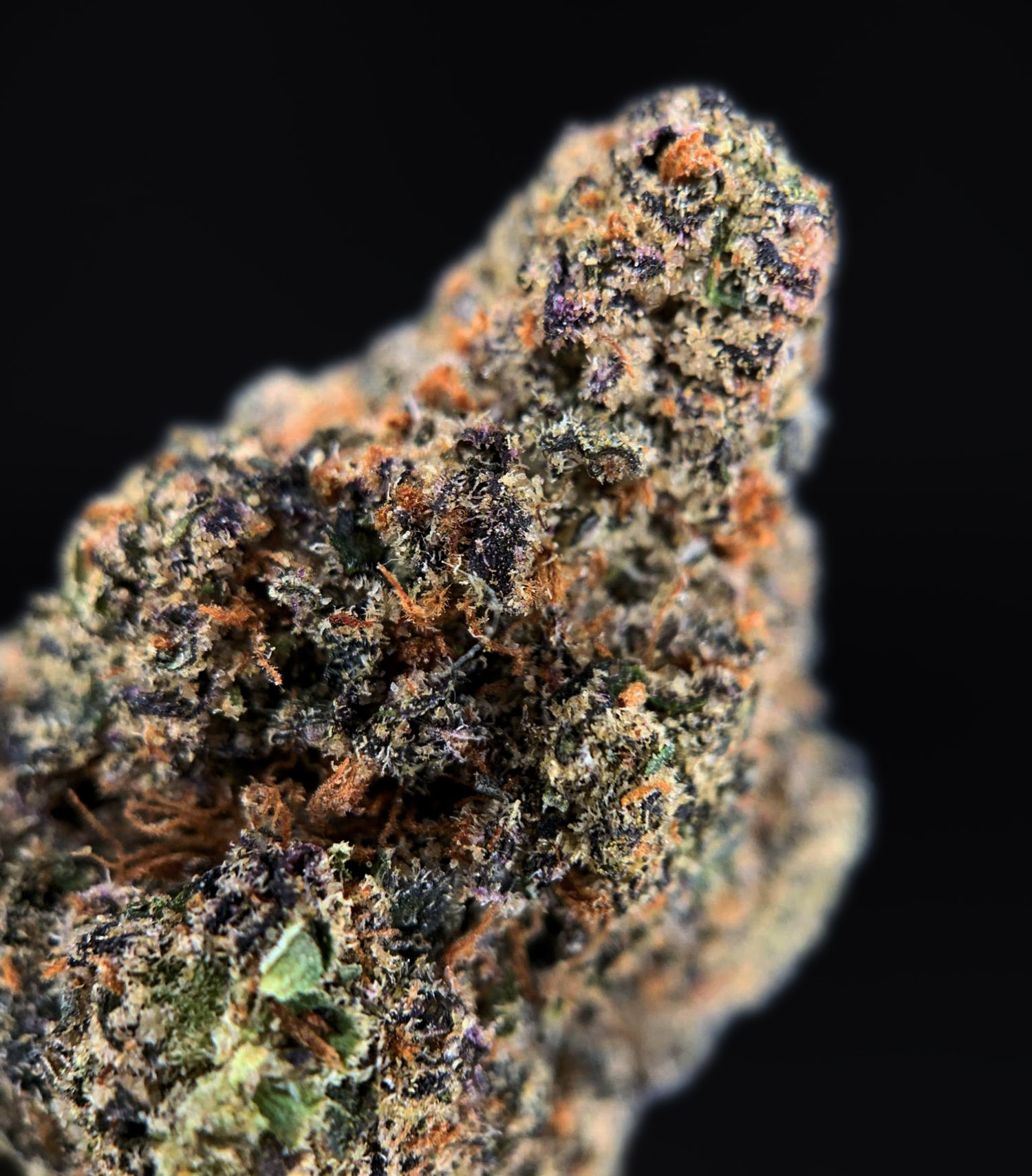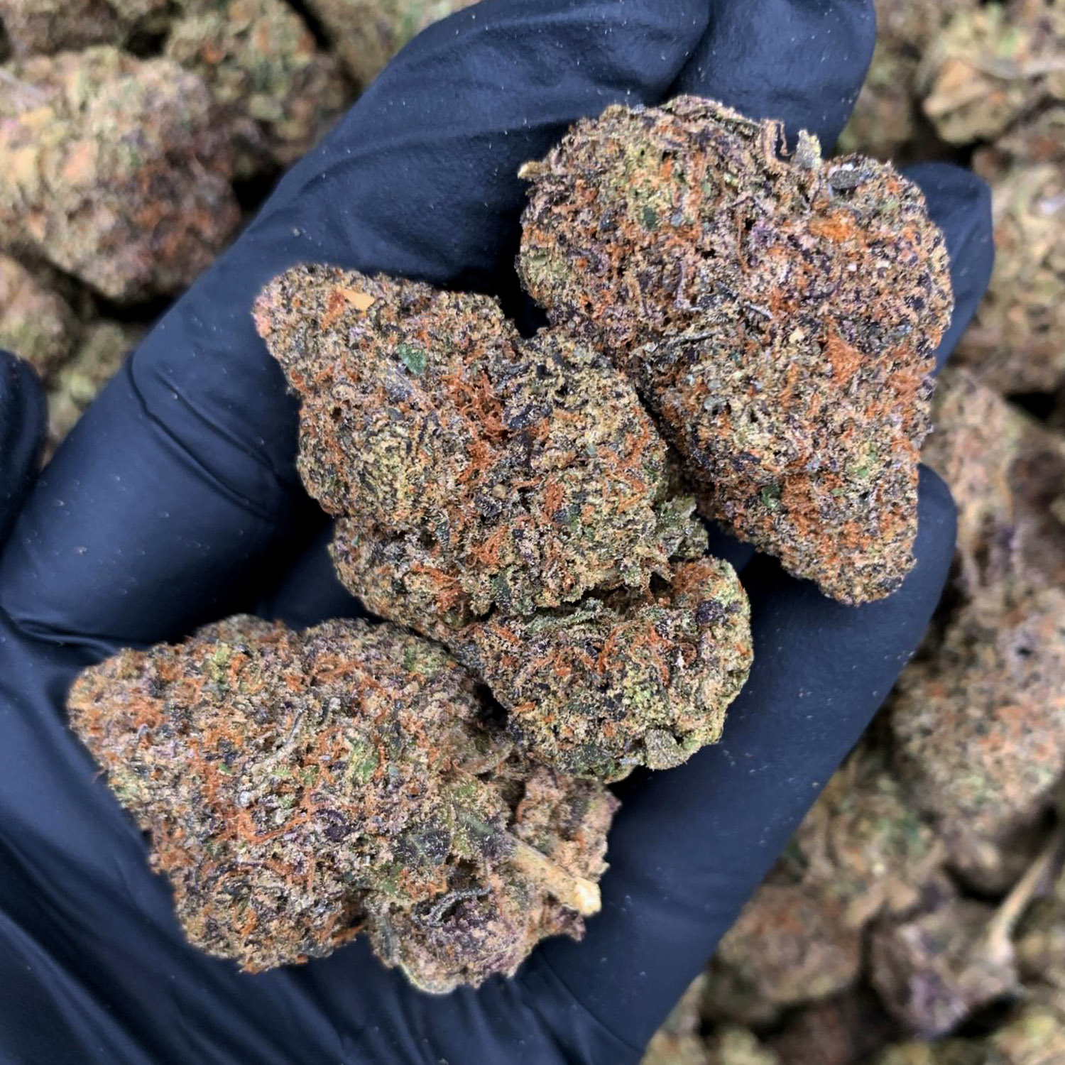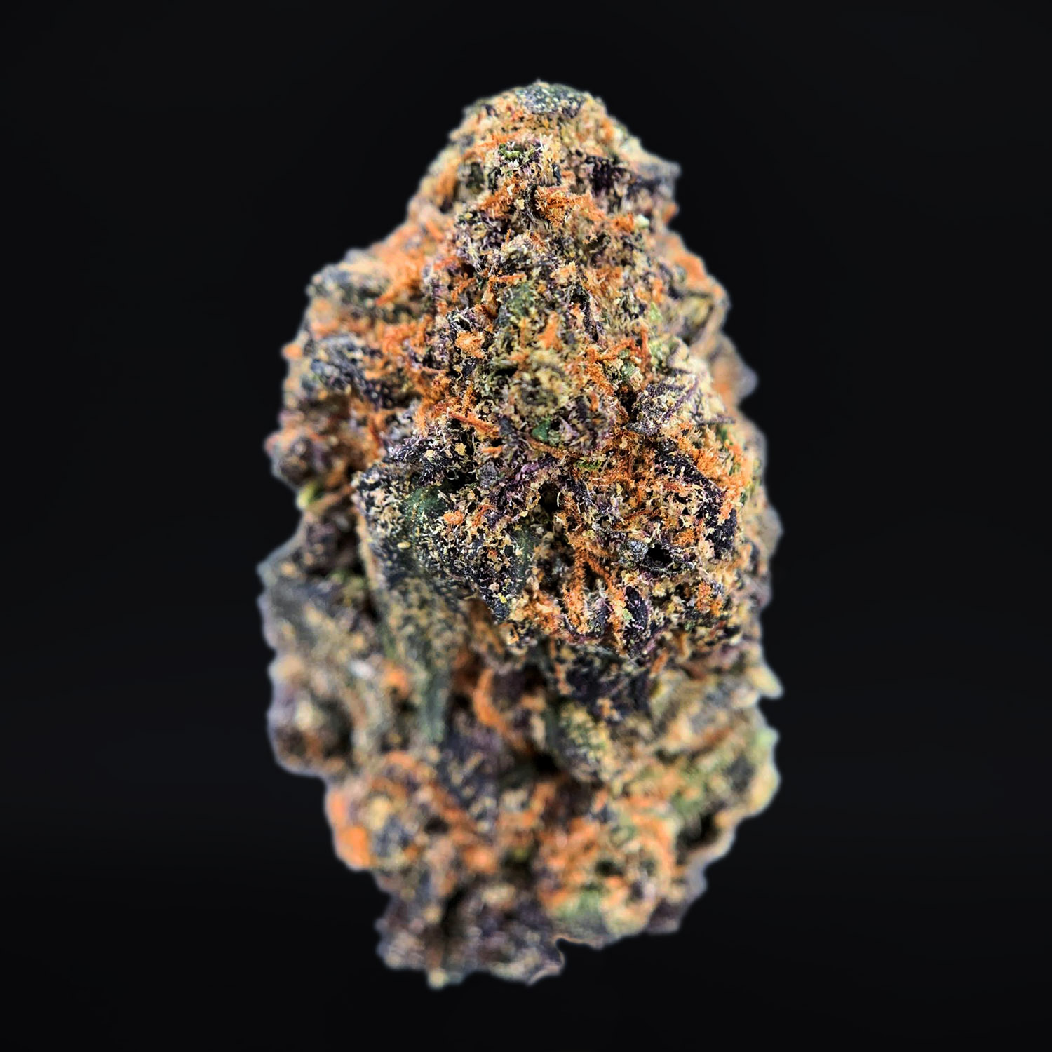 • Appearance: Dense, frosty buds with deep green and purple tones, covered in vibrant orange hairs