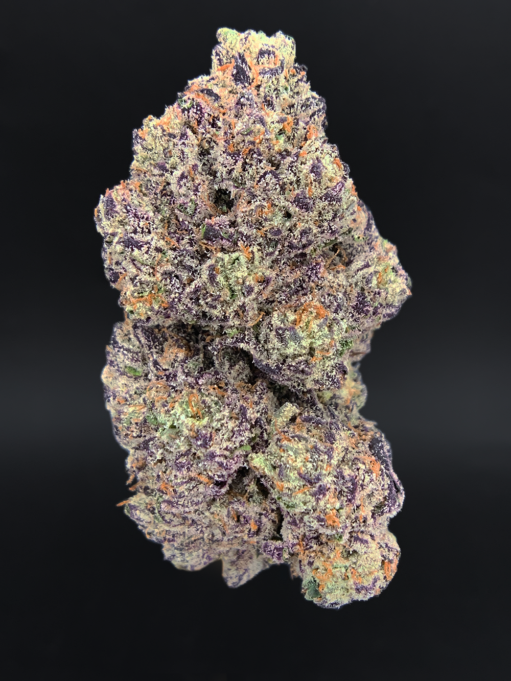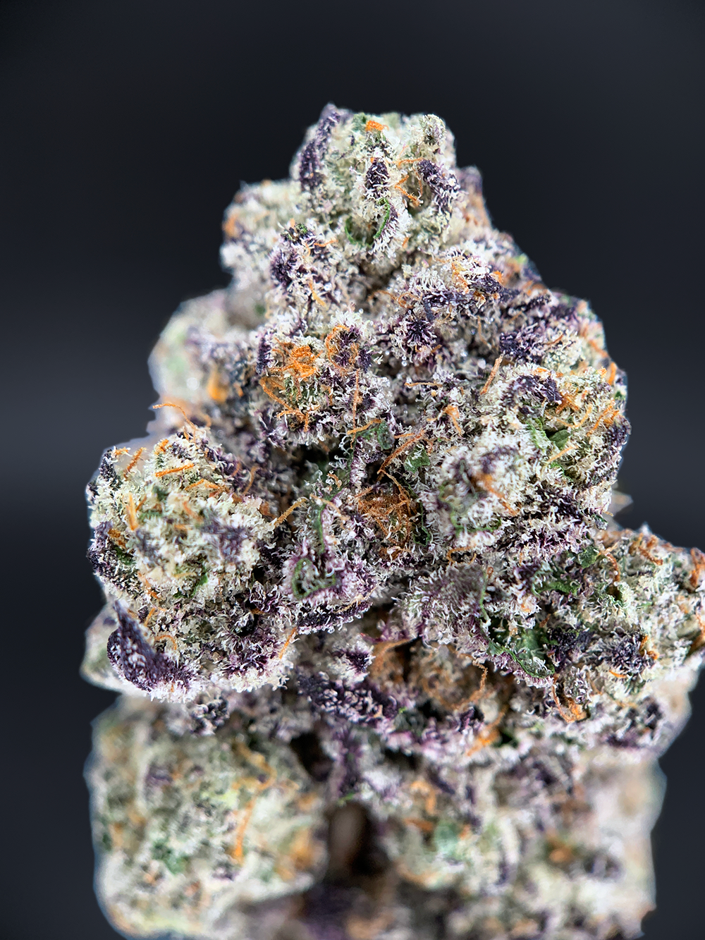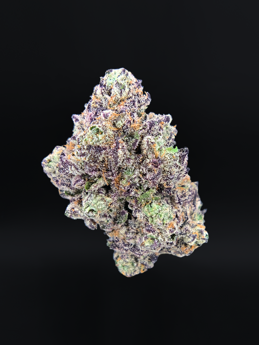 Appearance: Dense, olive-green buds wrapped in deep purple hues, sugar-frosted with crystal trichomes.